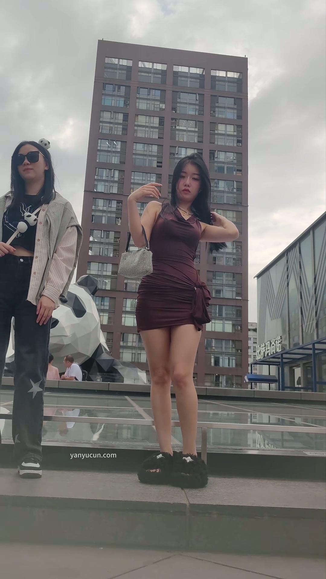 XM318棕色包臀裙极品性感美女网红打卡地拍照,白色丁字裤