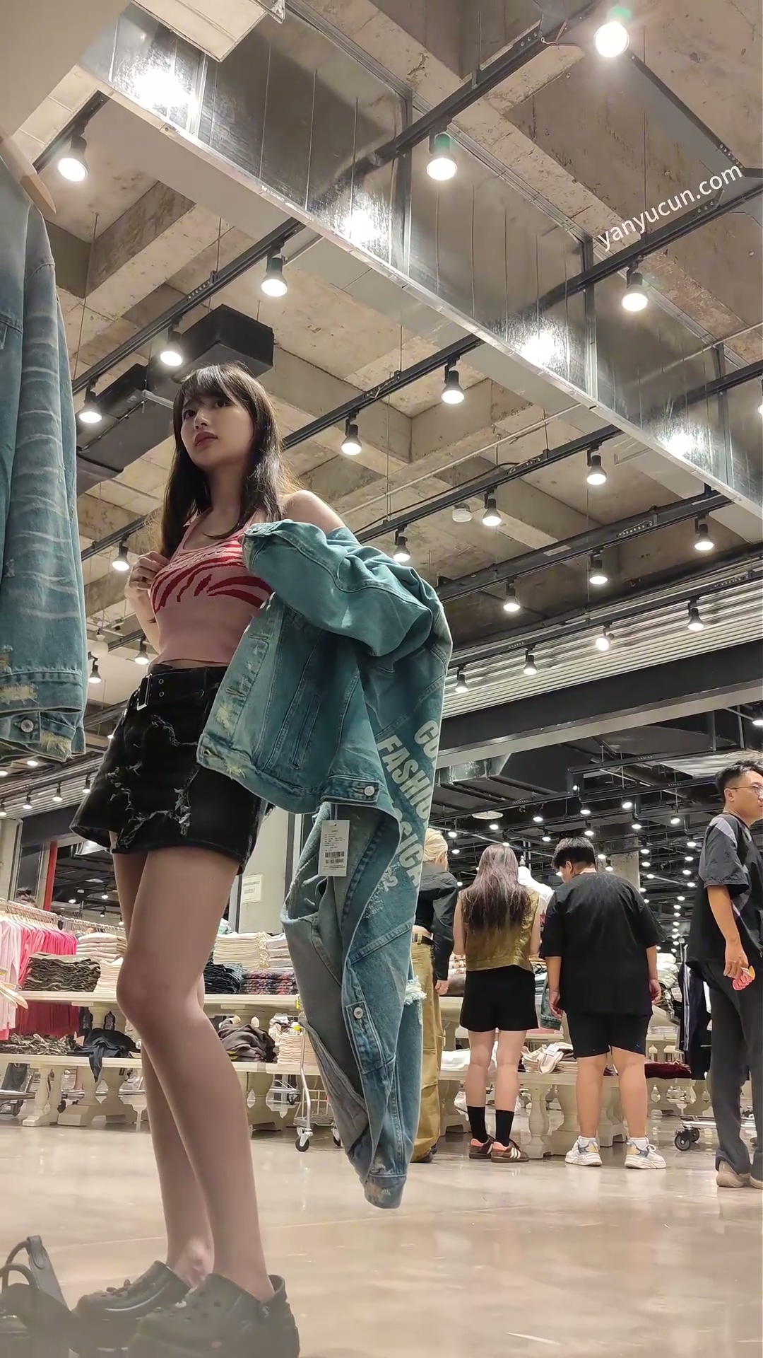 XM439牛仔短裙超极品美女逛街买衣服,粉白内内 439