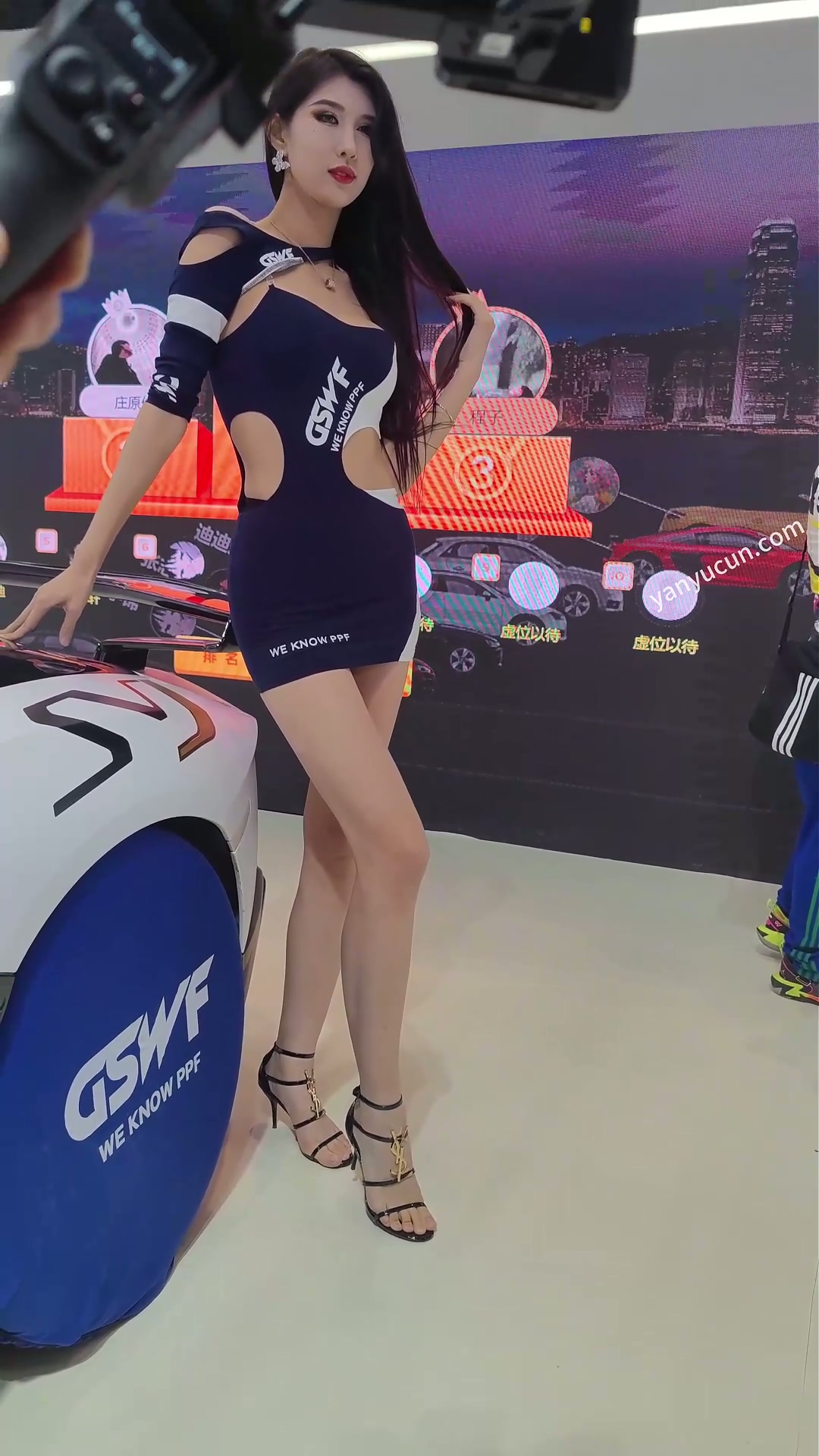XM470车展极品美女车模,绿色窄内