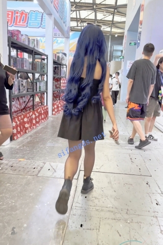 trump1025【KFC】短裙蓝头发学生妹逛街。黑色薄丝袜,条纹骚丁。